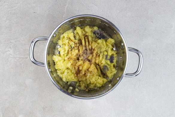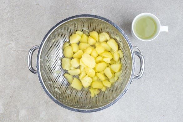 Den Backofen auf 220°C Umluft (240°C Ober-/Unterhitze) vorheizen. In einem mittleren Kochtopf ausreichend gesalzenes Wasser für die Kartoffeln zum Kochen bringen. Die Kartoffeln schälen, in das kochende Wasser geben und in 15–20Min. gar kochen. Ca. 1 Tasse Kochwasser abschöpfen, dann in ein Sieb abgießen und abtropfen lassen. Zurück in den Topf geben und warm halten.