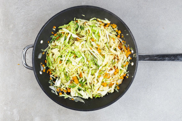 Die Zwiebelstreifen und die Karotten mit 1–2EL Olivenöl in einer weiteren großen Pfanne bei mittlerer bis starker Hitze 1–2Min. anbraten. Den Wirsing dazugeben und 2–3Min. mitbraten, dann mit 150ml Wasser ablöschen und das restliche Brühgewürz unterrühren. Den Wirsing unter Rühren 5–7Min. sanft köcheln lassen, bis die Flüssigkeit fast verdampft ist. Mit Salz und Pfeffer würzen.