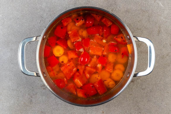 In einem großen Topf 3EL Pflanzenöl bei mittlerer Hitze erwärmen. Die Karotten und die Paprika in den Topf geben und ca. 3Min. braten. Den Knoblauch zugeben und ca. 1Min. mitbraten. Dann die Chiliflocken, 3EL Honig, 600ml Wasser, den Zitronensaft, 1TL Salz und 1 kräftige Prise Pfeffer unterrühren.