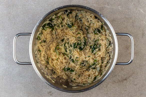 Die Zwiebeln in einem kleinen Topf mit 1EL Pflanzenöl bei mittlerer Hitze unter gelegentlichem Rühren in ca. 3Min. glasig anbraten. Ggf. 1EL Wasser zugeben, damit die Zwiebeln nicht anbrennen. Den Reis ca. 30Sek. unterrühren. Ca. ¾ der Kräuter und ½TL Salz zugeben und ca. 2Min. weiterrühren. Dann das kochende Wasser angießen und abgedeckt bei niedrigster Hitze 10–12Min. kochen.