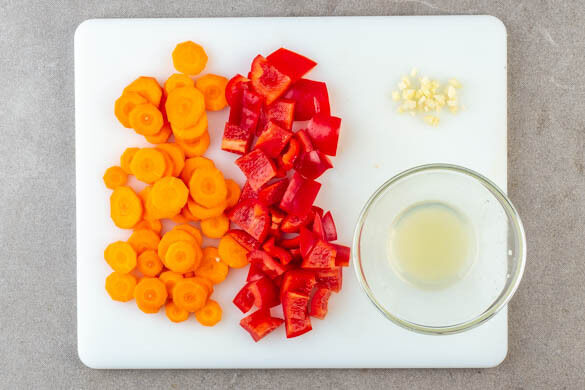 Die Karotte ggf. schälen und schräg in dünne Scheiben schneiden. Die Paprika vierteln, entkernen und in grobe Würfel schneiden. Den Knoblauch schälen und grob würfeln. Die Zitrone halbieren und auspressen.
