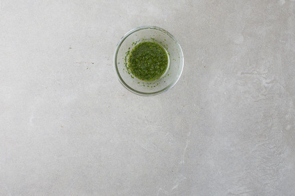 1–2EL Olivenöl, 1–2EL Essig, 1–2EL Wasser, Salz, Pfeffer und 1 Prise Zucker zu einem Dressing verrühren und den Schnittlauch untermischen.
