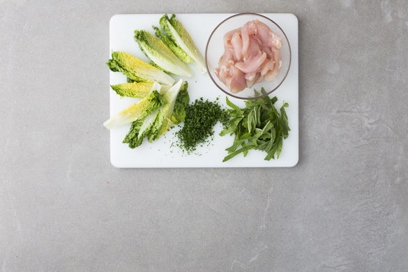 Das Fleisch mit etwas Küchenkrepp trocken tupfen und in dünne Streifen schneiden. Den Salat samt Strunk der Länge nach sechsteln. Die Minzeblätter von den Stängeln zupfen und in grobe Streifen schneiden. Den Schnittlauch in feine Röllchen schneiden. Den Feta mit den Fingern oder einer Gabel zerkrümeln.