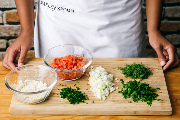 Die Semmelbrösel in 2EL kaltem Wasser einweichen. Die Zwiebeln schälen, halbieren und in feine Würfel schneiden. Die Petersilie samt Stängeln fein hacken. Die Dillspitzen abzupfen und fein schneiden. Den Schnittlauch in feine Röllchen schneiden. Die Tomaten vierteln, entkernen und in kleine Würfel schneiden.