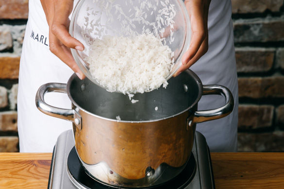 In einem mittelgroßen Topf 800ml Wasser leicht gesalzenes Wasser zum Kochen bringen. Den Reis in einem Sieb unter fließendem Wasser abspülen, bis das Wasser klar bleibt. Sobald das Wasser kocht, den Reis hineingeben und bei niedrigster Hitze abgedeckt 10–12Min. kochen, bis das Wasser aufgesogen und der Reis gar ist. Noch ca. 5Min. ohne Hitzezufuhr ziehen lassen.