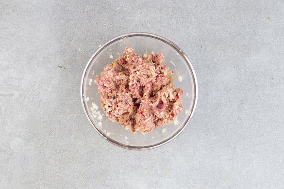 Das Hackfleisch mit dem gehackten Sauerkraut, der 1/2 der Zwiebeln, der 1/2 des Senfs sowie Salz und Pfeffer gut verkneten.