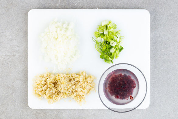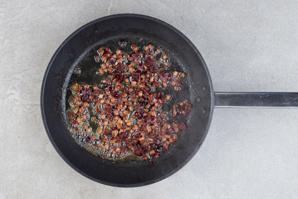 Den Backofen auf 200°C Umluft (220°C Ober-/Unterhitze) vorheizen. Das Sauerkraut in einem Sieb gut auswringen, dann 6–8EL Sauerkraut fein hacken. Die Zwiebeln schälen, halbieren und in feine Würfel schneiden. Die Lauchzwiebel in feine Ringe schneiden. Die Cranberrys grob hacken und in warmem Wasser einweichen.