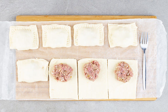 Die Teige mit dem Papier nach unten ausrollen und in jeweils 8 Vierecke schneiden. Die Hackfleischmasse jeweils auf der 1/2 eines Vierecks verteilen, dabei einen ca. 1cm breiten Rand frei lassen. Den Teig umklappen und die Ränder mit einer Gabel festdrücken. Die Piroggen mit dem Papier auf zwei Backbleche ziehen und ca. 15Min. im Ofen goldbraun backen.