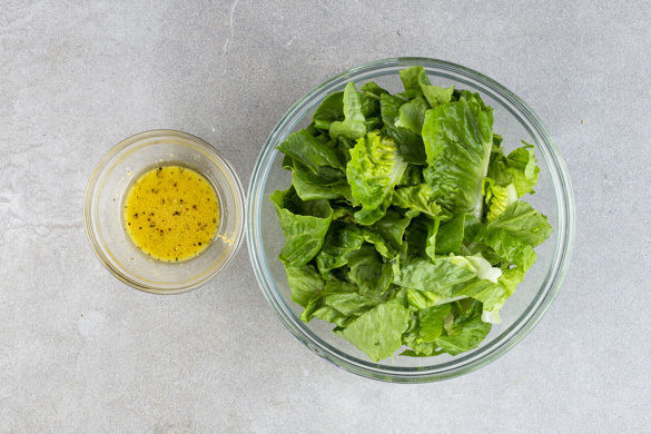 Den Salat in mundgerechte Stücke zupfen oder schneiden. Den restlichen Senf mit 3–4EL Olivenöl, 3–4EL Essig, 3–4EL Wasser sowie Salz, Pfeffer und 1 Prise Zucker zu einem Dressing verrühren und kurz vor dem Servieren mit dem Salat vermengen.