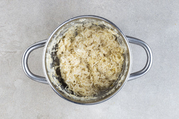 Die restlichen Zwiebeln in einem mittelgroßen Topf mit 1EL Öl bei mittlerer Hitze 1–2Min. farblos anschwitzen. Das restliche Sauerkraut hinzugeben, mit 200ml Wasser ablöschen und abgedeckt ca. 5Min. sanft köcheln lassen. Die 1/2 der Crème fraîche unterrühren, das Sauerkraut noch einmal aufkochen lassen und mit Salz und Pfeffer abschmecken.
