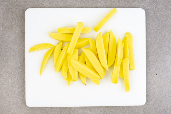 Den Backofen auf 220°C Umluft (240°C Ober-/Unterhitze) vorheizen. Die Kartoffeln ggf. schälen, in ca. 1cm dicke Scheiben und dann in pommesartige Stifte schneiden.