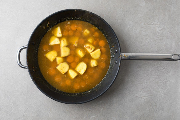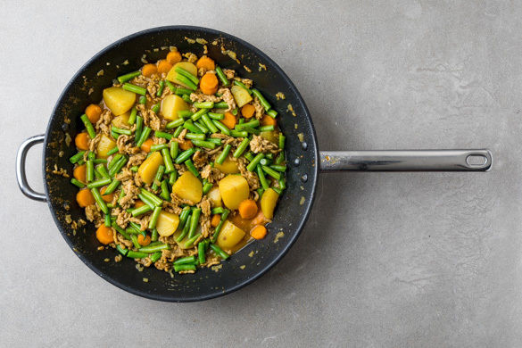 Die restlichen Gewürze in der Pfanne mit 1EL Olivenöl bei mittlerer Hitze ca. 30Sek. anbraten, dann ca. 3/4 der Zwiebeln hinzugeben und 3Min. mitbraten. Die Kartoffeln, die Karotten und die Brühe dazugeben, unter Rühren aufkochen lassen und abgedeckt 10Min. sanft köcheln lassen. Die Enden der Bohnen abschneiden und die Bohnen in ca. 2cm lange Stücke schneiden.