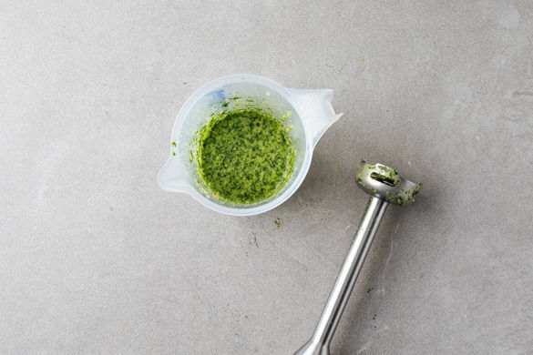 Die Zitrone halbieren und auspressen. In einem hohen Gefäß den Koriander samt Stängeln mit den restlichen Zwiebeln, 1–2EL Zitronensaft, 3EL Wasser, 1/2TL Salz und 1TL Zucker zu einem cremigen Pesto pürieren, dabei nach Bedarf ggf. mehr Wasser hinzugeben.