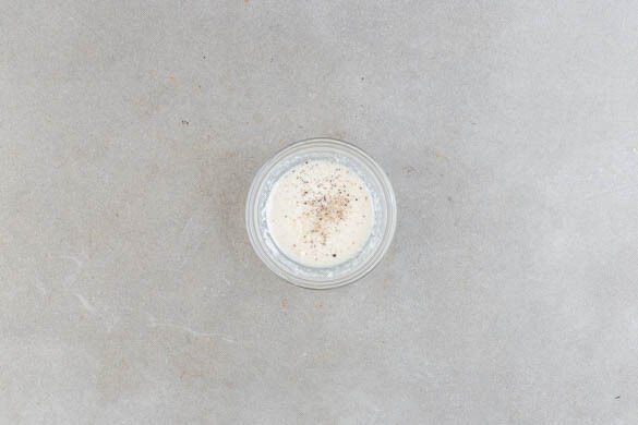 Den Käse fein reiben. Den Knoblauch schälen, halbieren und die ½ des Knoblauchs oder mehr nach Geschmack durch eine Knoblauchpresse drücken. Den Käse und den Knoblauch mit 2EL Mayonnaise, 1EL Wasser und 1TL Essig verrühren. Die Käsecreme mit Salz und Pfeffer abschmecken.