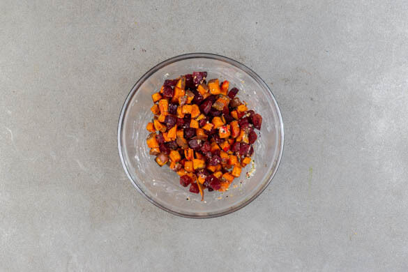 Das Gemüse auf einem mit Backpapier ausgelegten Backblech mit 1EL Olivenöl und je ½TL Salz und Pfeffer vermengen und 25–30Min. im Ofen backen, bis die Süßkartoffeln weich und die Rote-Bete-Würfel bissfest sind.