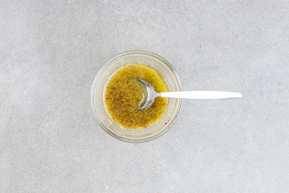 Den Honig, den Senf, 4EL Olivenöl und 2EL (hellen) Essig sowie Salz und Pfeffer zu einem Dressing verrühren.