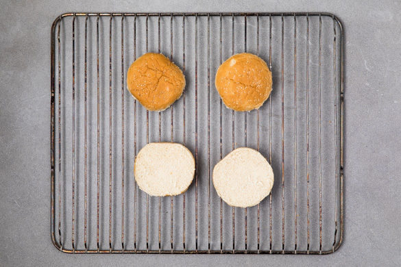 Die Burgerbrötchen halbieren und im Ofen 2–3Min. aufbacken.