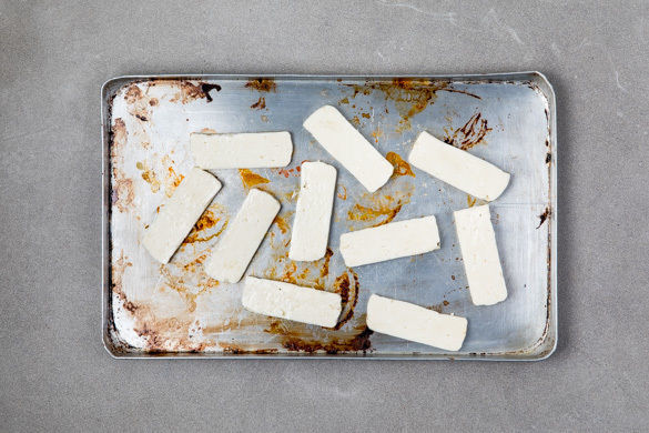Den Halloumi in ca. 0,5cm dicke Scheiben schneiden, auf das Gemüseblech geben und im Ofen 3–5Min. backen, bis der Halloumi knusprig und goldbraun ist. Den Käse wenden und weitere 3–5Min. backen.