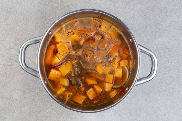 Die Karotten schälen, längs vierteln und schräg in 3–4cm lange Stücke schneiden. Die Süßkartoffel schälen und in ca. 2cm große Würfel schneiden. Die Tomaten in ca. 1cm große Würfel schneiden, dabei den Strunk entfernen. Die Zwiebel schälen, halbieren und in feine Würfel schneiden.