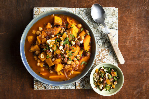 Die Tajine auf tiefe Teller oder Schalen verteilen und mit dem Aprikosen-Haselnuss-Topping garniert servieren.