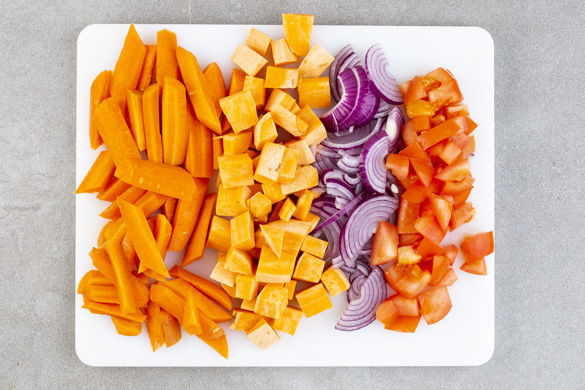 Die Karotten schälen, längs vierteln und schräg in 3–4cm lange Stücke schneiden. Die Süßkartoffel schälen und in ca. 2cm große Würfel schneiden. Die Tomaten in ca. 1cm große Würfel schneiden, dabei den Strunk entfernen. Die Zwiebel schälen, halbieren und in feine Würfel schneiden.