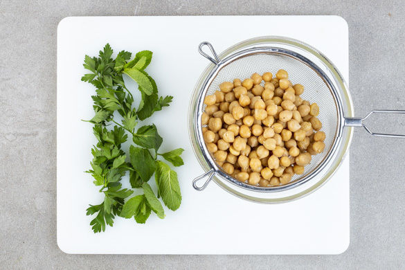 Die Kichererbsen in ein Sieb abgießen und mit kaltem Wasser abspülen. Die Minze- und die Petersilienblätter abzupfen.