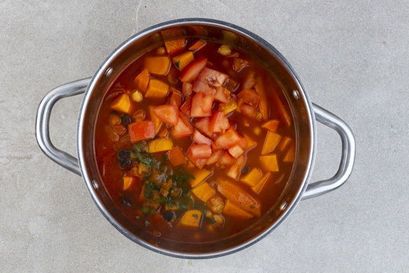 Die Karotten, die Süßkartoffeln, die Zwiebeln und die Kichererbsen in einem großen Topf mit 1–2EL Olivenöl bei mittlerer Hitze 2–4Min. anbraten. Die Gewürzmischung, das Tomatenmark sowie Salz und Pfeffer mit 900ml Wasser unterrühren und die Tajine 16–20Min. köcheln lassen. Ca. 5Min. vor Ende der Garzeit die Tomaten unterrühren und mitgaren.