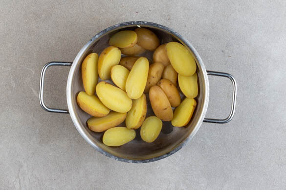Den Backofen auf 220°C (200°C Umluft) vorheizen. Einen mittelgroßen Topf mit ausreichend gesalzenem Wasser für die Kartoffeln zum Kochen bringen. Die Kartoffeln samt Schale längs halbieren, in das kochende Wasser geben und in 12–16Min. weich kochen. In ein Sieb abgießen, zurück in den Topf geben und abgedeckt warm halten.