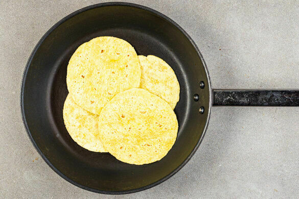 Die Tortillas in einer zweiten großen Pfanne bei mittlerer Hitze auf jeder Seite ca. 15Sek. erwärmen. Ggf. in mehreren Durchgängen arbeiten, je nach Größe der Pfanne. Tipp: Wer mag, kann die Tortillas auch aufeinanderstapeln, in ein sauberes, feuchtes Küchentuch einwickeln und 15–20Sek. in der Mikrowelle erwärmen.