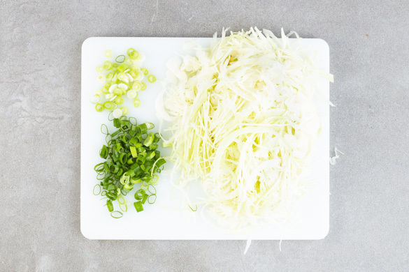 Die 1/2 des Weißkohls vom Strunk befreien und in feine Streifen schneiden. Den restlichen Kohl am nächsten Tag für einen schnellen Krautsalat in feine Streifen schneiden, mit Olivenöl, Essig, Salz und Pfeffer vermengen und ca. 15Min. ziehen lassen. Die Lauchzwiebel in feine Ringe schneiden, die grünen und die weißen Ringe separat aufbewahren.