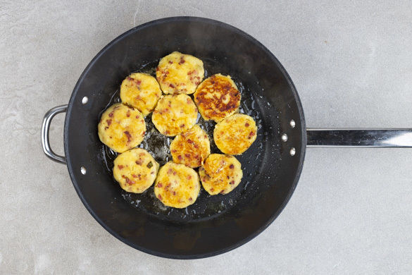 Die Kartoffeln stampfen. 1 Ei trennen. Das Eigelb mit 1–2EL Mehl sowie der Speckmischung zu den gestampften Kartoffeln geben und alles gut verkneten. Das Eiweiß wird nicht benötigt. Aus der Kartoffelmasse ca. 10 gleich große Kugeln formen, diese etwas flach drücken und die Küchlein in der Speckpfanne mit 2–3EL Pflanzenöl auf jeder Seite ca. 4Min. goldbraun braten.