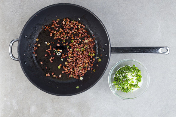 Den Speck und die weißen Lauchzwiebelringe in einer großen Pfanne ohne Zugabe von Fett bei mittlerer bis starker Hitze 3–4Min. anbraten. Die Crème fraîche mit den grünen Lauchzwiebelringen verrühren und den Dip mit Salz und Pfeffer abschmecken.