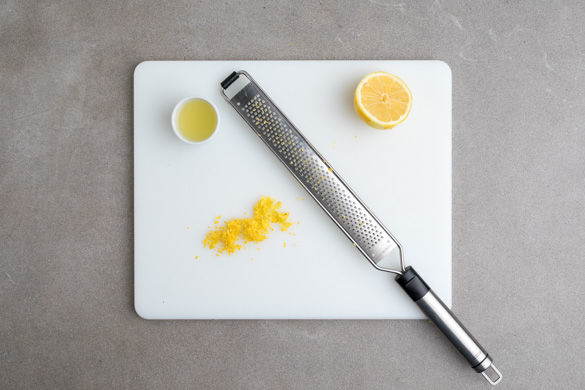 Die Zitronenschale fein abreiben, dann die Zitrone halbieren und auspressen.