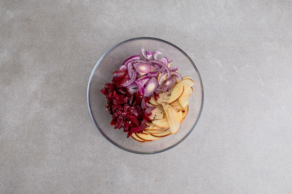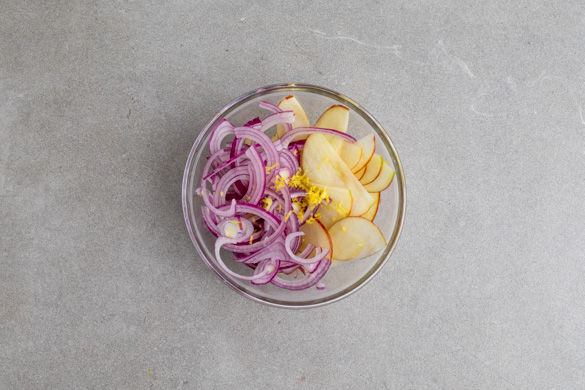 Die Äpfel vierteln, entkernen und in feine Scheiben schneiden. Mit 1–2EL Zitronensaft und 1–2TL Zitronenabrieb vermengen. Tipp: Wer mag, kann mehr Zitronensaft und -schale verwenden. Die Zwiebel schälen, halbieren und in feine Streifen schneiden.