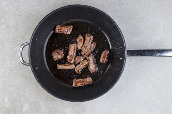 Das Fleisch mit etwas Küchenkrepp trocken tupfen und leicht schräg in dünne Scheibchen schneiden. Mit Salz und Pfeffer würzen und in einer weiteren großen Pfanne mit 1EL Olivenöl bei starker Hitze auf jeder Seite ca. 1Min. scharf anbraten. Auf einem Teller beiseitestellen. Den Bratensatz in der Pfanne mit der Sojasauce ablöschen und ca. 1Min einköcheln lassen.