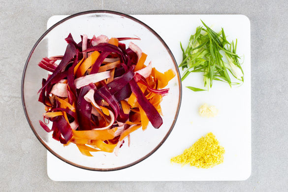 Die Karotten und die Petersilienwurzeln schälen und mit dem Sparschäler in lange Streifen schneiden. Ca. 1/3 des Essigs mit 1EL Zucker und 1TL Salz verrühren, unter die Karotten- und Petersilienwurzelstreifen mischen und beiseitestellen. Die Lauchzwiebeln schräg in feine Ringe schneiden. Den Ingwer und den Knoblauch schälen und fein reiben.