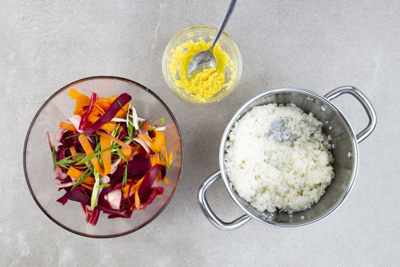 Den restlichen Reisessig mit dem Ingwer, dem Knoblauch und 1–2TL Zucker verrühren und nach Geschmack unter den Reis mischen. Das marinierte Gemüse mit Salz und Pfeffer würzen und die Lauchzwiebeln unterheben. Die Tonkatsu mit dem Reis und dem Gemüse anrichten und mit dem Sriracha-Ketchup servieren.