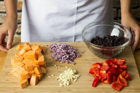 Den Backofen auf 200°C (180°C Umluft) vorheizen. Die Bohnen in einem Sieb mit kaltem Wasser abspülen und abtropfen lassen. Die Süßkartoffeln schälen und grob würfeln. Die Paprika halbieren, entkernen und in mundgerechte Stücke schneiden. Die Zwiebeln und den Knoblauch schälen und fein würfeln.