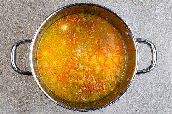Die Zwiebeln, den Ingwer und den Knoblauch in einem mittelgroßen Topf mit 1EL Pflanzenöl bei starker Hitze ca. 2Min. anbraten, dabei gelegentlich umrühren. Den Kürbis mit den Karotten und 1 Prise Salz dazugeben und ca. 2Min. mitbraten.