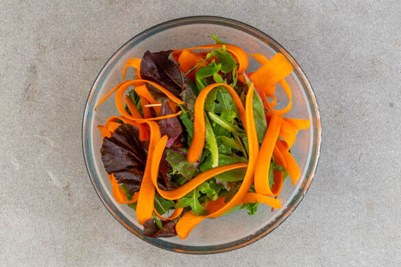 4EL Olivenöl, 2EL Balsamicoessig, 1–2EL Wasser, 2TL Honig und je 1 kräftige Prise Salz und Pfeffer zu einem Dressing verrühren. Eine Handvoll Salat beiseitelegen, den restlichen Salat mit den Karottenstreifen unter das Dressing mengen.