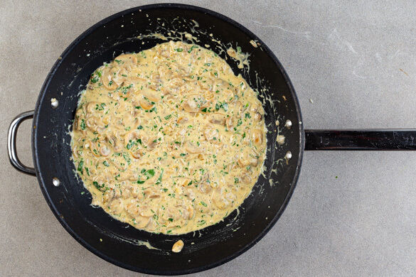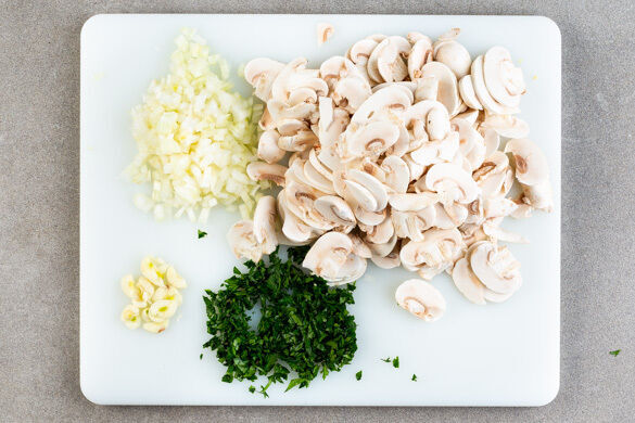 Die Pilze ggf. säubern und in dünne Scheiben schneiden. Die Zwiebeln schälen, halbieren und fein würfeln. Den Knoblauch schälen und in dünne Scheibchen schneiden. Die Petersilie samt Stängeln fein schneiden.