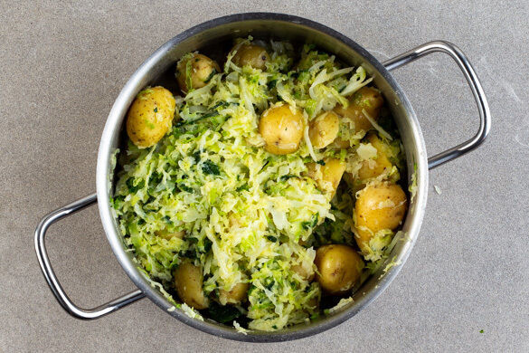 Die Kartoffeln und die Minze in das kochende Wasser geben und ca. 4Min. kochen lassen. Dann den Wirsing dazugeben und das Gemüse 8–10Min. weiterköcheln, bis die Kartoffeln und der Wirsing gar sind.