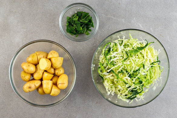 In einem mittelgroßen Topf 500ml Wasser mit ½TL Salz zum Kochen bringen. Größere Kartoffeln samt Schale halbieren. Den Wirsing halbieren und in dünne Streifen schneiden, dabei den Strunk entfernen. Die Minzeblätter abzupfen und grob schneiden.