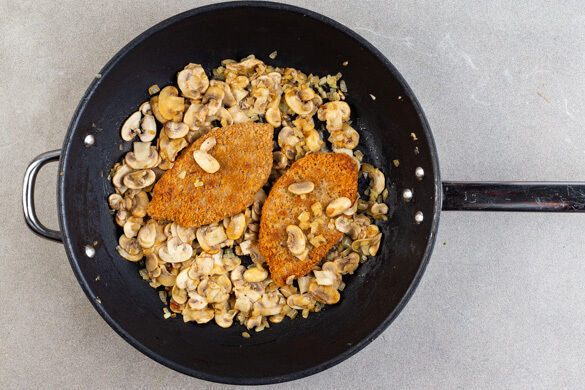 Die Bohnenschnitzel, die Pilze, die Zwiebeln und den Knoblauch in einer großen Pfanne mit 1EL Pflanzenöl bei starker Hitze anbraten. Die Schnitzel auf jeder Seite ca. 3Min. braten und aus der Pfanne nehmen. Die Pilze und die Zwiebeln gelegentlich umrühren, sodass sie gleichmäßig bräunen.