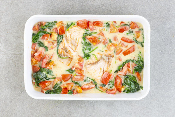 Die Sauce über dem Fisch verteilen und die Auflaufform für 10–12Min. in den Ofen geben. Die Sauce nach Belieben mit der Zitronenschale verfeinern und den Fisch mit den Ofenkartoffeln servieren.