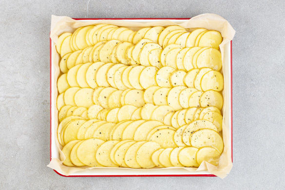 Die Kartoffeln samt Schale in ca. 0,5cm dünne Scheiben schneiden und fächerartig auf einem mit Backpapier ausgelegten Backblech verteilen. Mit ca. 1–2EL Olivenöl beträufeln, mit Salz und Pfeffer würzen und anschließend ca. 15Min. im Ofen knusprig backen. Während der letzten 5Min. den Käse auf den Kartoffeln verteilen und mitbacken.