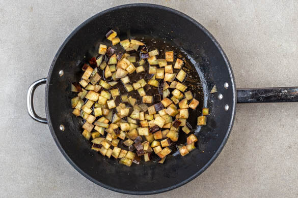 In einem mittelgroßen Topf ausreichend gesalzenes Wasser für die Pasta zum Kochen bringen. Inzwischen die Aubergine in ca. 1cm kleine Würfel schneiden und in einer mittelgroßen Pfanne mit 2EL Pflanzenöl und 150ml Wasser bei mittlerer Hitze 8–10Min. braten, bis die Auberginenwürfel sehr weich sind. Mit je 1 Prise Salz und Pfeffer würzen und aus der Pfanne nehmen. Die Pfanne aufbewahren.