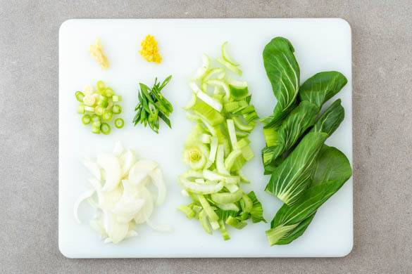 Den Knoblauch schälen und sehr fein würfeln. Ca. ⅓ des Ingwers schälen und fein hacken. Die Zwiebel schälen, halbieren und in feine Streifen schneiden. Den weißen Teil der Lauchzwiebel in ca. 0,5cm große Stücke, den grünen Teil in feine Ringe schneiden. Die grünen Pak-Choi-Blätter ganz lassen, den weißen Teil in ca. 1cm breite Streifen schneiden.