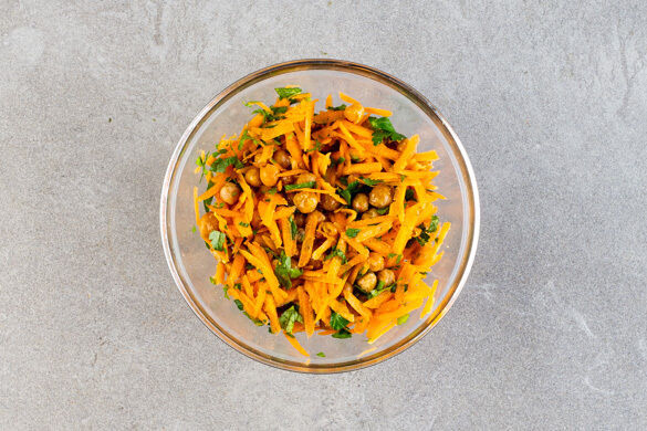 Die Karotte ggf. schälen und grob reiben. Die Petersilien- und die Minzeblätter abzupfen und grob schneiden. Die Karotten mit den Kräutern und den Kichererbsen vermengen und den Salat mit 1EL Olivenöl, 1EL Essig und je 1 Prise Salz und Pfeffer würzen. Die Tajine mit dem Salat anrichten, mit den restlichen Granatapfelkernen garnieren und servieren.