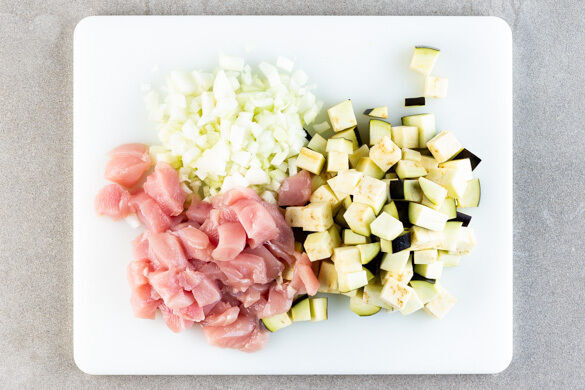 Den Backofen mit Grillfunktion oder Ober-/Unterhitze auf 250°C vorheizen. Die Aubergine in 1,5–2cm große Würfel schneiden. Die Zwiebel schälen, halbieren und fein würfeln. Das Fleisch trocken tupfen und in 2–3cm große Würfel schneiden.